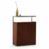 Το πάνω μέρος του επίπλου διαθέτει δύο κλειστές πόρτες, οι οποίες κρύβουν αποθηκευτικό χώρο για ποτά ή σκεύη. Μια διακριτική, οριζόντια μεταλλική λαβή σε μπρονζέ απόχρωση βρίσκεται στο κέντρο των θυρών, προσθέτοντας μια νότα κομψότητας. Κάτω από τις πόρτες, υπάρχει ένας ανοιχτός χώρος με ένα ενσωματωμένο ράφι, το οποίο είναι σε ανοιχτότερη, ουδέτερη απόχρωση, δημιουργώντας μια διακριτική αντίθεση. Το ράφι αυτό είναι ιδανικό για την προβολή διακοσμητικών αντικειμένων ή την προετοιμασία ποτών.