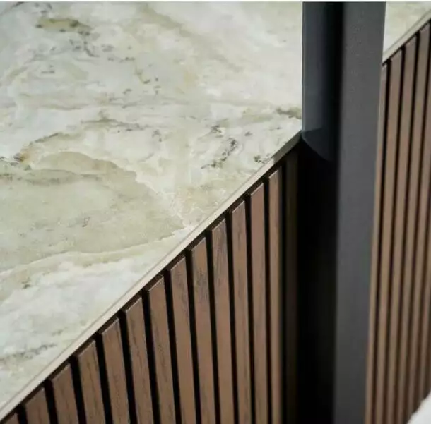 Στο κάτω μέρος, ένα ενσωματωμένο τμήμα αποθήκευσης τραβάει το βλέμμα με την πολυτελή του εμφάνιση. Η πρόσοψη από ξύλο σε ζεστή, καφέ απόχρωση με λεπτές, κάθετες ραβδώσεις προσθέτει μια αίσθηση υφής και ζεστασιάς. Η κορυφή του τμήματος αποθήκευσης είναι επενδυμένη με μια λεπτή πλάκα από μάρμαρο σε ανοιχτόχρωμους τόνους, προσφέροντας μια νότα κομψότητας και αναδεικνύοντας την ποιότητα των υλικών.