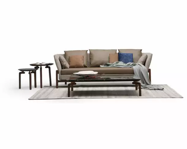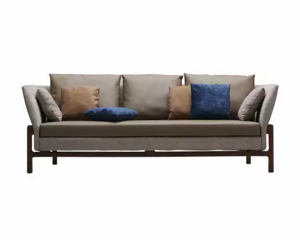 Κομψός τριθέσιος καναπές διαθέτει έναν αρμονικό συνδυασμό υλικών και χρωμάτων που αποπνέουν άνεση και στυλ. Ο σκελετός του καναπέ, κατασκευασμένος από σκούρο ξύλο καρυδιάς, και τα μαξιλάρια ειναι απο δέρμα