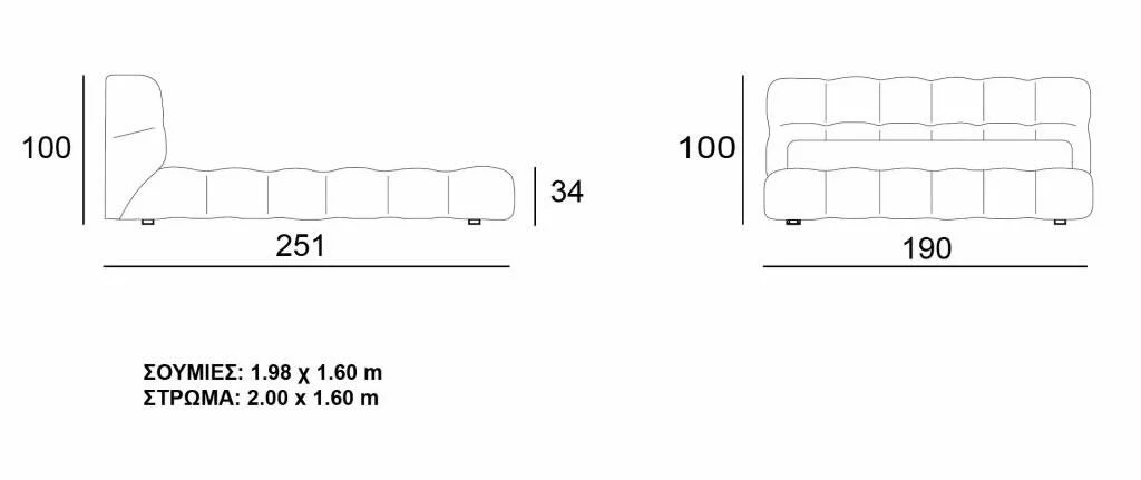 Το κεφαλάρι του κρεβατιού είναι ψηλό επενδυμένο με ένα μαλακό, ουδέτερο ύφασμα, το οποίο συνεχίζει την κομψή γραμμή της βάσης. Η συνολική αισθητική του κρεβατιού είναι μινιμαλιστική αλλά ταυτόχρονα επιβλητική, κάνοντάς το το επίκεντρο κάθε υπνοδωματίου. Η σχεδίασή του με την εκτεταμένη βάση προσκαλεί σε χαλάρωση και δημιουργεί έναν χώρο ηρεμίας και άνεσης.