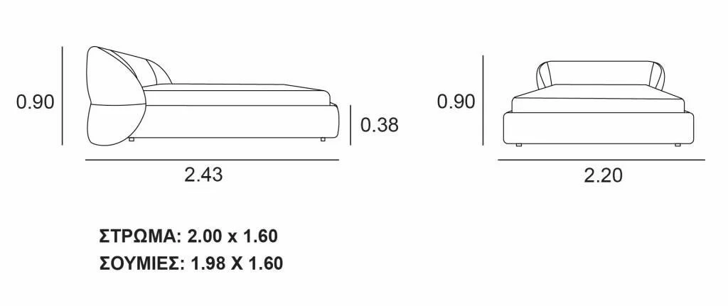 Κεφαλάρι και πλαίσιο με eco friendly αφρώδες υλικό ανοιχτής κυψέλης, ντυμένο με ύφασμα ή δέρμα και ξύλινο σκελετό.