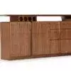 Αυτό το κομψό sideboard, ξεχωρίζει για τον μοντέρνο και μινιμαλιστικό του σχεδιασμό που επικεντρώνεται στις απαλές, καμπυλωτές γραμμές. Η επιφάνεια του μπουφέ είναι σε έναν θερμό, φυσικό τόνο ξύλου, πιθανόν δρυς ή καρυδιά, το οποίο προσδίδει ζεστασιά και διαχρονική κομψότητα.