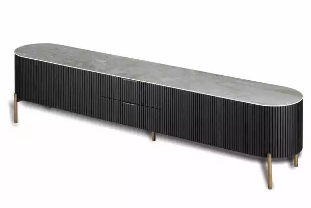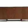 Το ιδιαίτερο χαρακτηριστικό του είναι η μεταλλική του βάση, η οποία προσδίδει μια σύγχρονη και στιβαρή εμφάνιση, αναδεικνύοντας τις καθαρές γραμμές του επίπλου. Ένα ξεχωριστό στοιχείο design είναι η ενσωμάτωση κεραμικού υλικού στην επιφάνεια του μπουφέ. Το κεραμικό προσθέτει μια νότα πολυτέλειας και λειτουργικότητας, καθώς είναι ανθεκτικό σε γρατζουνιές και θερμότητα.