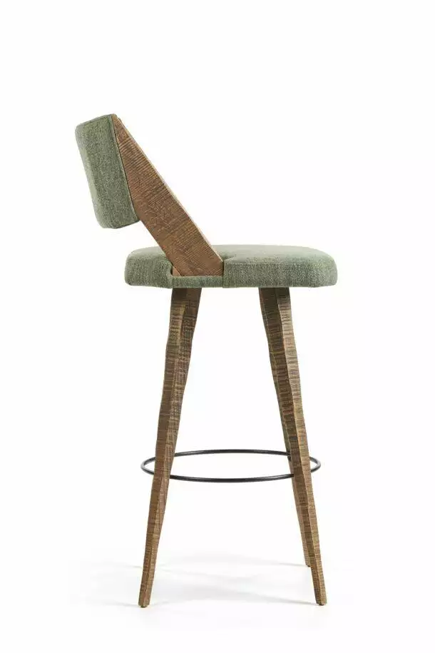 Ο σχεδιασμός της πλάτης είναι ιδιαίτερα ενδιαφέρων, καθώς αναπτύσσεται ομαλά από το κάθισμα, δημιουργώντας μια ενιαία, αρμονική καμπύλη που αγκαλιάζει τον χρήστη. Τα πόδια είναι κωνικά και κατασκευασμένα από σκούρο ξύλο, πιθανώς καρυδιά ή δρυ, το οποίο προσφέρει μια όμορφη αντίθεση με το ανοιχτόχρωμο ύφασμα και ενισχύει τη στιβαρότητα του σκαμπό. Η απουσία υποποδίου τονίζει τις καθαρές γραμμές και την απλότητα του design, καθιστώντας το ιδανικό για μοντέρνους χώρους, όπως μπαρ, νησίδες κουζίνας ή ακόμα και ως πρόσθετο κάθισμα σε έναν χώρο lounge.