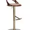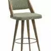 Ο σχεδιασμός της πλάτης είναι ιδιαίτερα ενδιαφέρων, καθώς είναι σχετικά χαμηλή, ορθογώνια και μοιάζει να αιωρείται ελαφρώς πάνω από το κάθισμα, προσφέροντας μια μοντέρνα αισθητική. Τα πόδια είναι λεπτά, κωνικά και κατασκευασμένα από ξύλο σε θερμό, φυσικό τόνο, τα οποία ανοίγουν ελαφρώς προς τα έξω, ενισχύοντας την αίσθηση σταθερότητας και τον σύγχρονο του χαρακτήρα. Ένας μαύρος, μεταλλικός δακτύλιος περιβάλλει τα πόδια στο κάτω μέρος, λειτουργώντας ως υποπόδιο και προσθέτοντας μια σύγχρονη, βιομηχανική πινελιά που έρχεται σε όμορφη αντίθεση με το ξύλο. Ο συνδυασμός των υλικών και η λιτή, λειτουργική γραμμή του το καθιστούν ιδανικό για μοντέρνους χώρους, πάγκους κουζίνας ή μπαρ, προσφέροντας τόσο στυλ όσο και άνεση.
