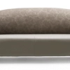 Η επένδυση σε απαλό γκρι/μπεζ δέρμα υψηλής ποιότητας αναδεικνύει την κομψότητα του καναπέ. Η πτυχωτή λεπτομέρεια στην πλάτη προσθέτει μια ενδιαφέρουσα υφή και μια αίσθηση χαλαρής πολυτέλειας. Η βάση του καναπέ είναι διακριτική, με χαμηλά πόδια σε σκούρο ξύλο ή μέταλλο, δημιουργώντας την αίσθηση ότι ο καναπές αιωρείται ελαφρά πάνω από το δάπεδο.