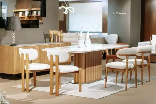 Tραπεζαρία με εντυπωσιακά μασίφ πηχάκια, τη μεταλλική λεπτομέρεια στη βάση και το κεραμικό καπάκι δημιουργούν ένα μοναδικό αποτέλεσμα μοντέρνας αισθητικής για το χώρο της τραπεζαρίας σας. Η διάσταση της κεραμικής επιφάνειας σε συνδυασμό με τη βάση της χαρίζει μια minimal αισθητική και προσφέρει την αίσθηση μιας μεγαλοπρεπούς τραπεζαρίας για όσους επιθυμούν την επιτομή της αισθητικής στην τραπεζαρία τους.