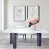 Εντυπωσιακοί κύλινδροι σε χρυσοπατίνα ως βάση σε συνδυασμό με την διαχρονική κομψότητα και μοντέρνα αισθητική που προσφέρει η κεραμική επιφάνεια δημιουργούν την τραπεζαρία αυτή.