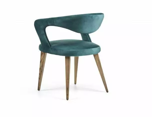 Αυτή η καρέκλα, διακρίνεται για τις καμπυλωτές γραμμές της και το σύγχρονο, αλλά και κλασικό της στυλ. Η επένδυση είναι από ένα πλούσιο, τιρκουάζ/πετρόλ βελούδινο ύφασμα, το οποίο προσδίδει βάθος στο χρώμα και μια αίσθηση πολυτέλειας.
