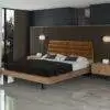 Ο vintage καπλαμάς και το μασίφ ξύλο, τόσο στο κρεβάτι όσο και στο πλαίσιο, δένουν αρμονικά με τη μεταλλική βάση του πλαισίου, καθώς και με τα στοιχεία λάκας στα κομοδίνα και την τουαλέτα.