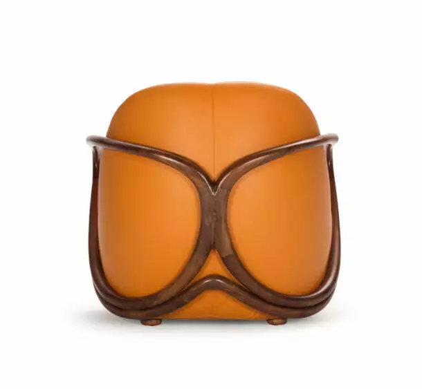 Η επένδυση της πολυθρόνας είναι από μαλακό πορτοκαλί δέρμα, το οποίο αναδεικνύει τις καμπύλες του σχεδιασμού και προσφέρει μια αίσθηση πολυτέλειας και άνεσης. Η ραφή στην πλάτη δημιουργεί μια διακριτική λεπτομέρεια και ενισχύει την τρισδιάστατη μορφή της πολυθρόνας.